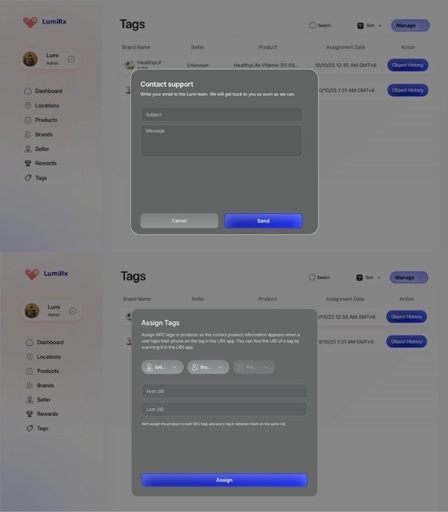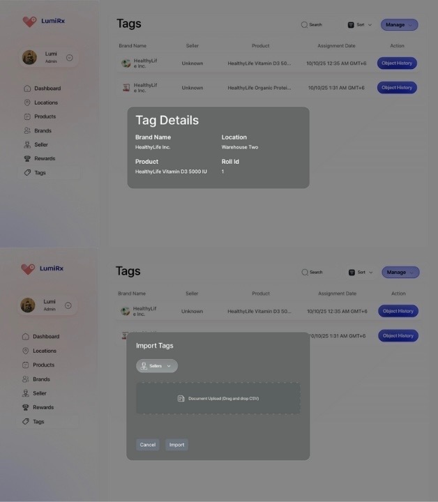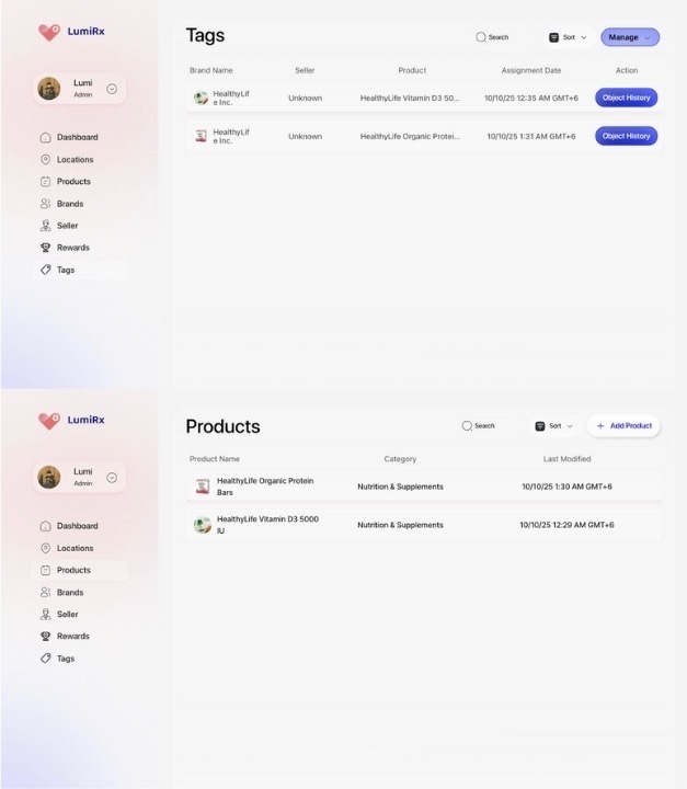 Once tagged, products are managed through a centralized Admin Portal that tracks their journey through the physical infrastructure.